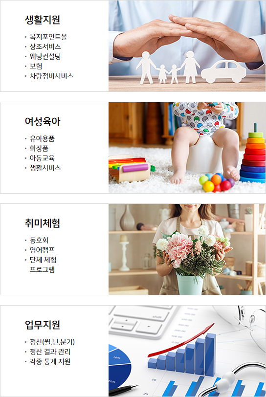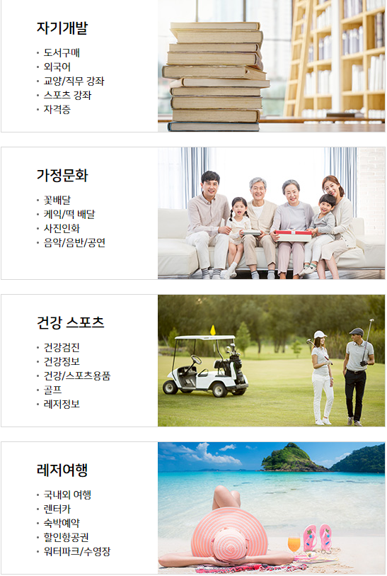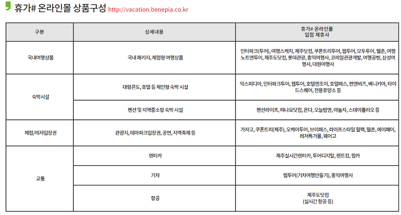 폐쇄몰이다 보니까 어떤 상품이 있는지 모르시겠지만 국내 여행이라면 렌터카를 이용한다거나 숙박을 예약할 때 쓸 수 있는 여행 중심 상품들입니다. 국내 여행만 지원을 하기 때문에 해외로 휴가 계획이 있는 분들은 해당 사항이 없습니다.