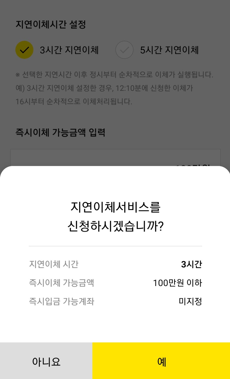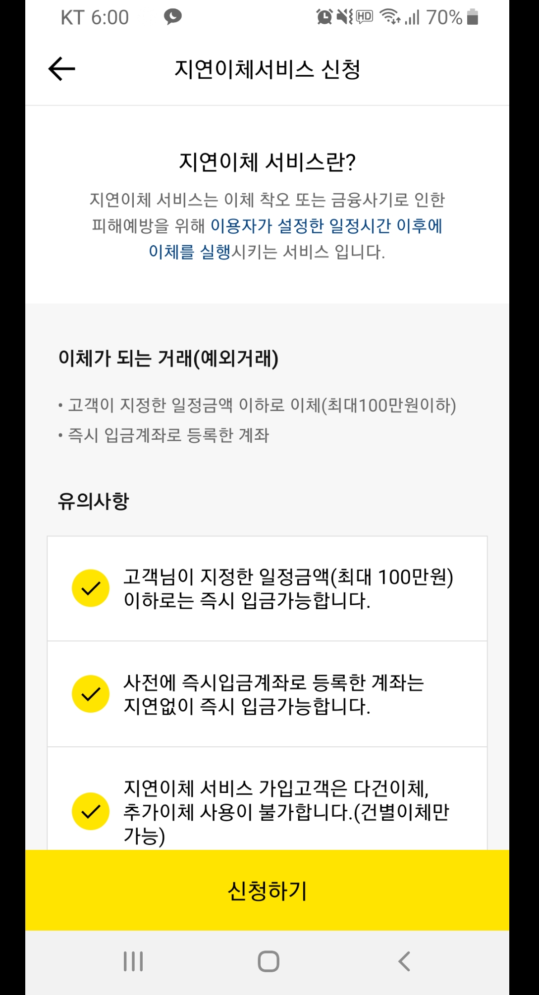 Step5. 원하는 지연이체 시간과 즉시이체 가능금액 입력 후 자주 쓰는 가족이나 특정계좌가 있다면 입금 가능한 계좌로 등록한 후 신청하기를 선택한다.