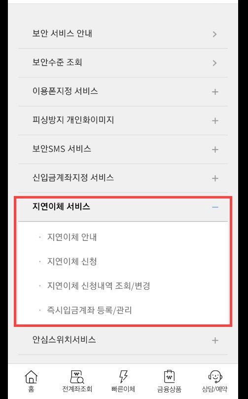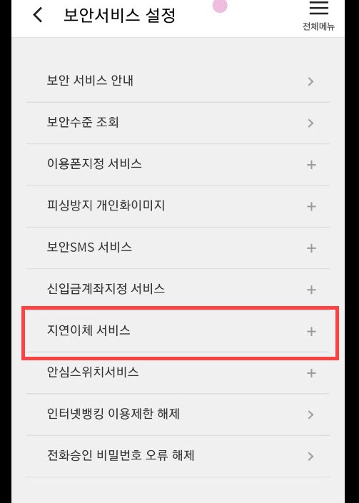 보안 설정 메뉴리스트 중 다시 보안 서비스 설정을 선택합니다. 그러면 이제 지연이체 서비스 메뉴가 보입니다. 지연이체 서비스를 선택합니다. 지연이체 안내 또는 지연이체 서비스 신청 메뉴가 보이는데요 [지연이체 서비스 신청]을 선택합니다.