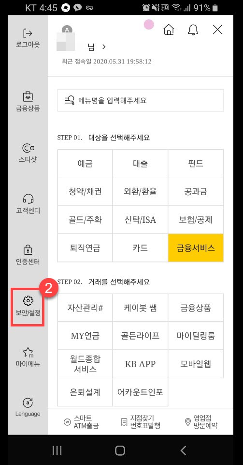 모바일앱에서 공인인증서로 로그인 후 오른쪽 상단의 [전체메뉴]를 선택합니다. 전체 메뉴 선택 후 보안설정을 다시 선택합니다.