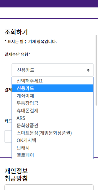 이제 신용카드번호와 결제일자를 선택 하고 조회하기를 선택하면 됩니다. 이제 결제했던 내용이 기억이 나실 겁니다.